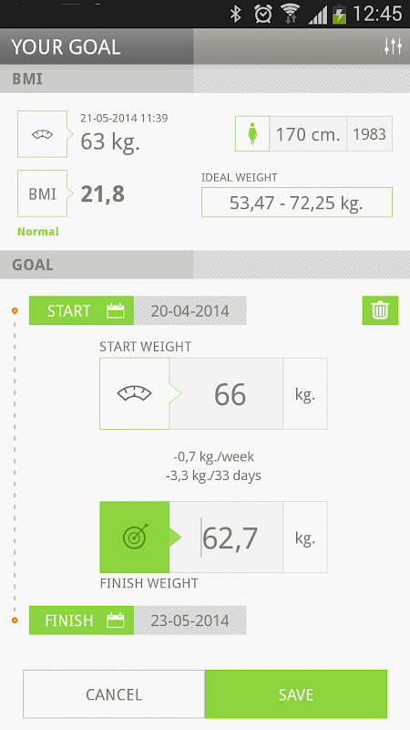 This app also calculates your BMI and suggests your ideal weight as your goal to reach.