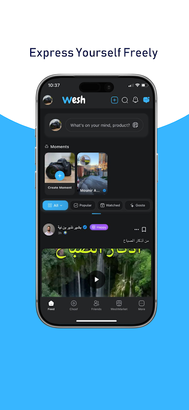 ويش ليس مجرد تطبيق تواصل اجتماعي، بل هو مجتمع ينتمي إليه الجميع. صُمّمت منصتنا ببساطة وسهولة استخدام، وتضمن لك التركيز على ما هو مهم: التواصل مع الأشخاص والمحتوى الذي يهمك.