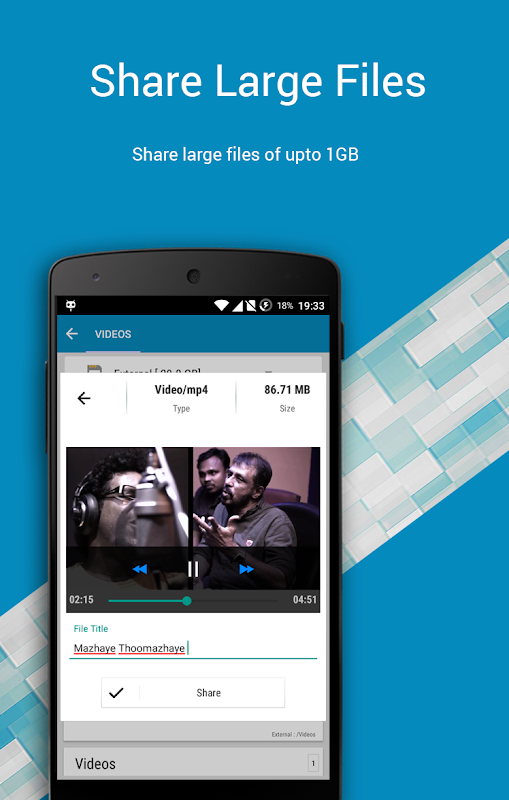 ☆ Any File Type: Share any type of file Archives, Docs, EBooks, Music, Images, Gif Videos of up to 1 GB via any Instant messaging app installed in your phone.