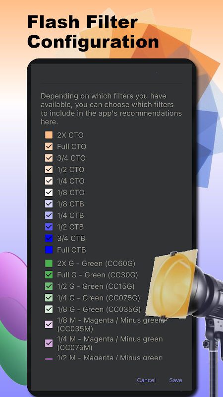 🔦 توصيات فلتر الفلاش - يقترح تلقائيًا أنواع جل الفلاش CTO وCTB والأخضر والأرجواني لوضعها على مصابيح الفلاش لتتناسب مع الإضاءة المحيطة