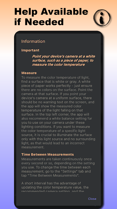 لضمان أفضل دقة ممكنة، يستخدم هذا التطبيق ورقة بيضاء عادية أو بطاقة رمادية لقياس درجة حرارة اللون (CT، درجة حرارة اللون المترابطة، CCT). تأكد فقط من إضاءة الورقة بمصدر الضوء الذي تقيسه، وتجنب أي تشوهات لونية. مع أن المعايرة ليست ضرورية عادةً، إلا أنها تُحسّن الدقة بشكل أكبر.