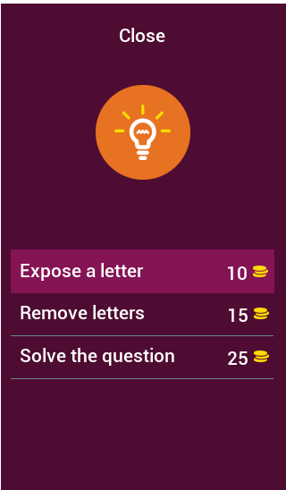 Your brain overheating? In Who's Missing, we offer several ways to help the player to get back on track such as show one correct letter, remove an incorrect letter, or reveal the right answer altogether!