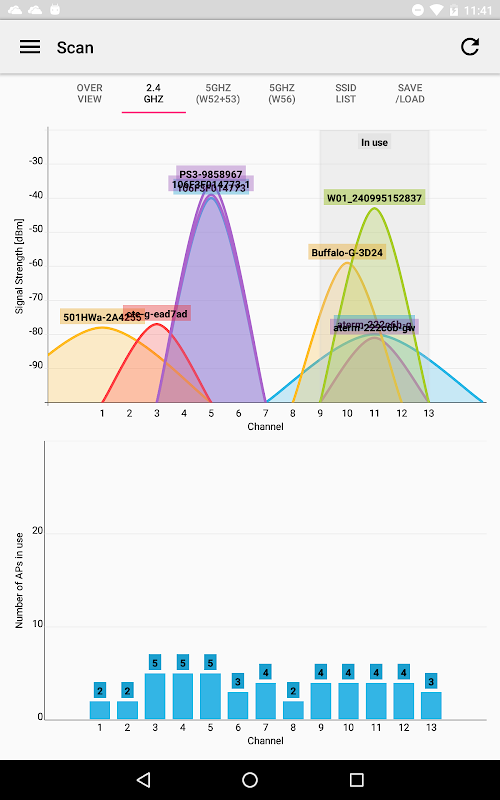 يمكنك مسح شبكة Wi-Fi المحيطة وتصور ازدحام القناة وقوة الإشارة كرسم بياني.