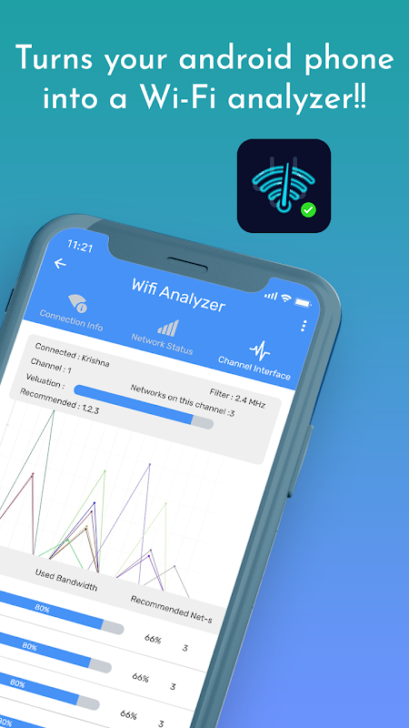 WiFi Signal Strength app is constantly updating the signal strength so you can walk around your house, work, or anywhere to find the best WiFi signal. WiFi Analyzer Recommends the best channel and place for your network and gives you the most useful optimization information to help decrease interference and increase connection speed and stability.