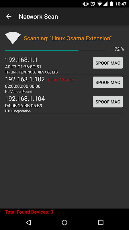 3- شبكة الماسح الضوئي: مسح شبكة متصلة الحالية للأجهزة المتصلة ومحاكاة ساخرة أي عنوان ماك اتصال