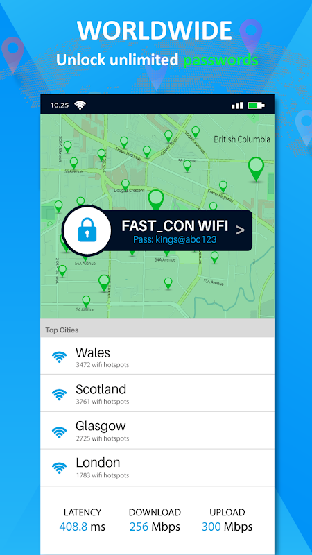 WiFi Map - WiFi Password key Show & WiFi Connect هي أداة شديدة الاستخدام للحصول على وصول مجاني لشبكة wifi في جميع أنحاء العالم. بمساعدة خريطة WiFi المجانية مع تطبيق كلمة المرور ، يمكنك الانضمام إلى شبكات Wi-Fi المجانية والبحث في شبكات wifi العامة والخاصة والانضمام تلقائيًا. لا توجد مشكلة في مكانك ، فهذه أفضل طريقة لتصفح الإنترنت مجانًا. يكتشف تطبيق خريطة كلمات مرور wifi هذا اتصالات wifi المجانية من حولك. لا توجد قيود على البيانات ، ولا تكلف أي بيانات ، فهي مجانية تمامًا وسهلة الإعداد. يمكنك إضافة شبكات WiFi من حولك ومشاركتها مع الآخرين. طريقة سهلة للعثور على كلمات مرور WiFi. يساعدك مفتاح Wifi Password في العثور على جميع شبكات WiFi وتوصيلها وإدارتها ، ويمكنك العثور على نقطة اتصال WiFi مجانية من حولك ، واستعادة جميع كلمات مرور wifi المفقودة وإظهار جميع كلمات مرور wifi. يمكنك أيضًا التحقق من سرعة تحميل وتنزيل بيانات wifi.