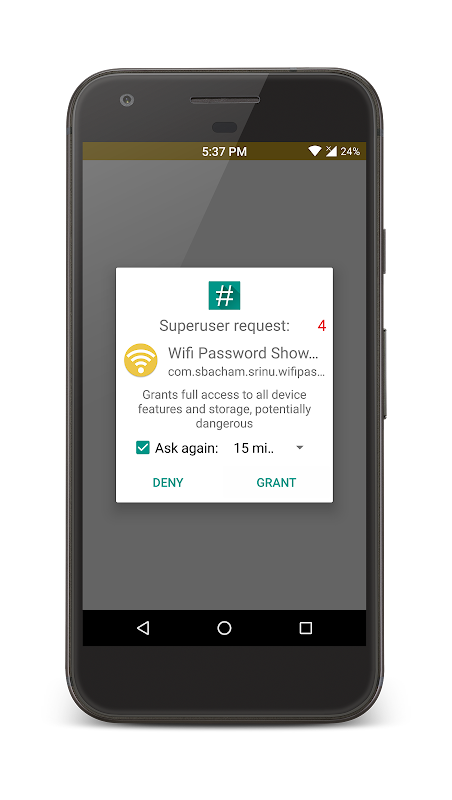 يعمل تطبيق "إظهار كلمة مرور الواي فاي" أيضًا كمؤشر على ما إذا كان الجهاز متمتعًا بصلاحيات الروت أم لا. إذا ظهر مربع حوار صلاحيات المستخدم الفائق عند فتح التطبيق، فهذا يعني أن جهازك يتمتع بصلاحيات الروت. سيُعلمك تطبيق "إظهار كلمة مرور الواي فاي" بأن جهازك غير متمتع بصلاحيات الروت أو لم يحصل على صلاحيات الروت.