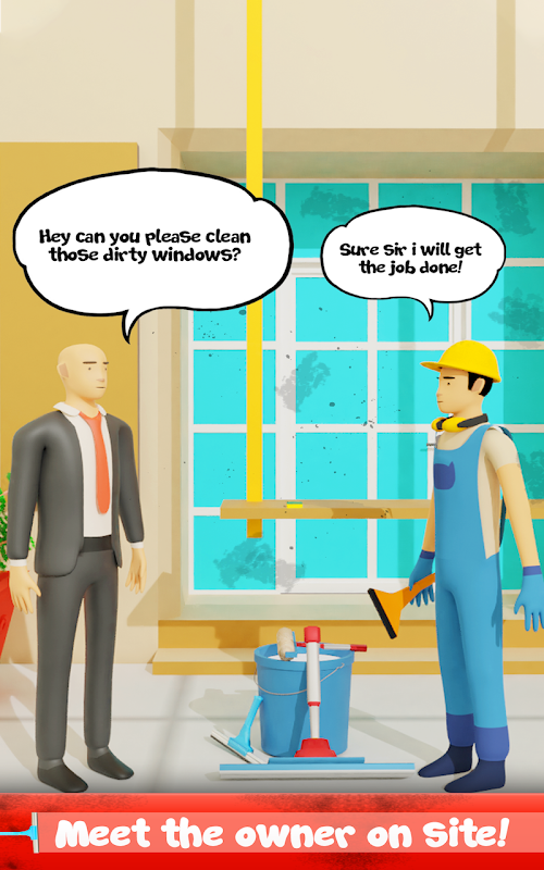 At the end of the level, if the window is cleared - the sound is made and vibration. A clean window appears and behind it, you can see what is happening in the office. Each level - a new action is shown in the office