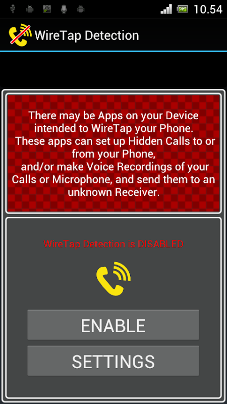 هذا التطبيق - "كشف التنصت" - سوف حمايتك من التعرض للتجسس على في هذه الطرق، من خلال الكشف عن محاولات للاستفادة من الهاتف الخاص بك. قبل أن تريد أن تجعل من تسجيل نفسك - أو الصوت عبر بروتوكول الإنترنت (مثل سكايب) نداء - ببساطة لمس زر لتعطيل التطبيق.