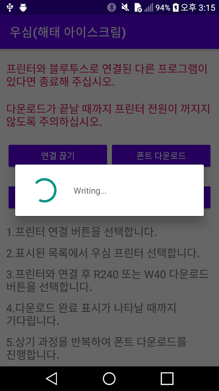 تطبيق يسمح لك بتنزيل البرامج الثابتة وملفات الخطوط المعدلة بحيث يمكن طباعة أحرف Hangeul 'Byeon على طابعات Woosim W40 و R240 المقدمة إلى HAITAI Ice Cream.