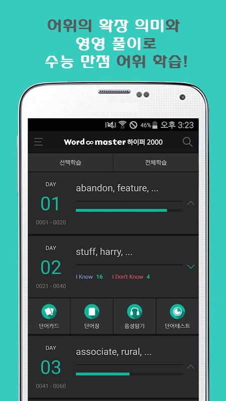 워드마스터 고유의 ‘Yes I Know’ 학습법으로 단어, 뜻, 예문을 하나의 카드에서 확인할 수 있으며, 한 번의 터치로 다음 단어로 이동이 쉬워졌습니다. 각 단어와 연관있는 유의어, 반의어, 관련어도 함께 제공합니다.