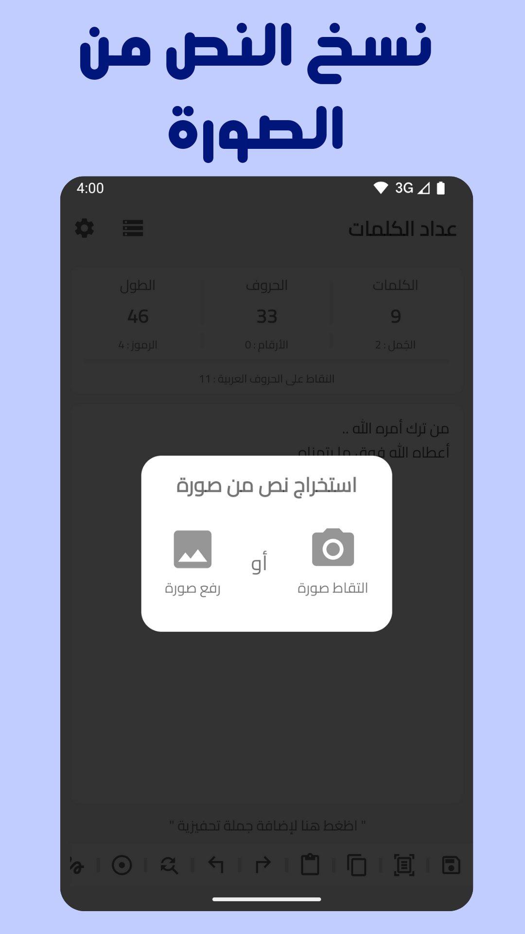 ⁍ تحويل الصورة إلى نص (OCR): التقط صورة لأي مستند أو ارفعها من معرض الصور لتحويلها فوراً إلى نص قابل للتعديل.