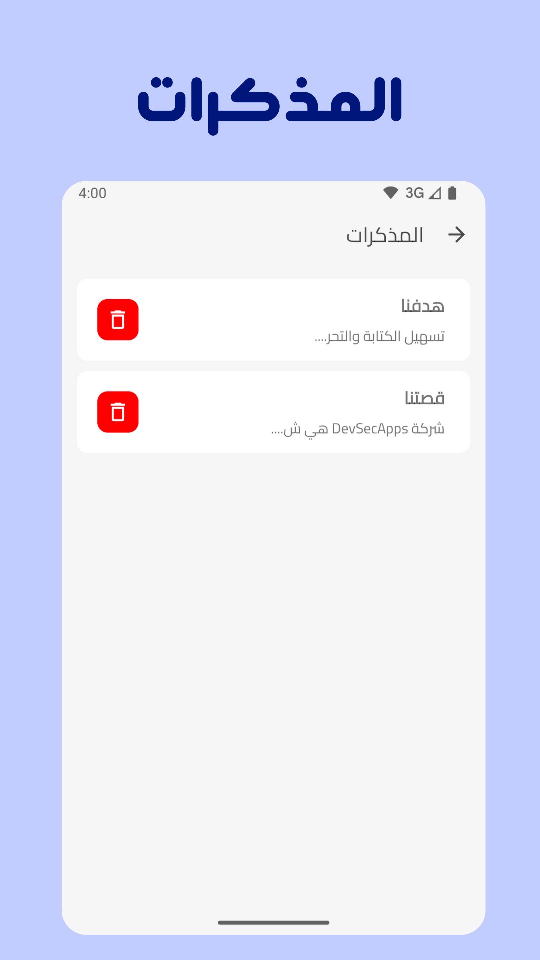 الحفظ الآمن داخل التطبيق: احفظ مسوداتك وملاحظاتك داخل التطبيق بخصوصية تامة؛ بياناتك محمية ولا يمكن ⁍ للتطبيقات الأخرى الوصول إليها.