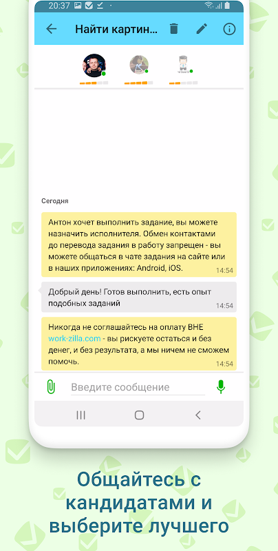 سيساعدك تطبيق من بورصة Workzilla الشهيرة في العثور بسرعة على وظيفة عن بعد أو العكس - قم بتعيين مساعد للعمل أو الأمور الشخصية. يضع العملاء مجموعة متنوعة من المهام على Workzilla: من "شراء تذاكر مباراة" إلى "ترجمة نص من الهندية".