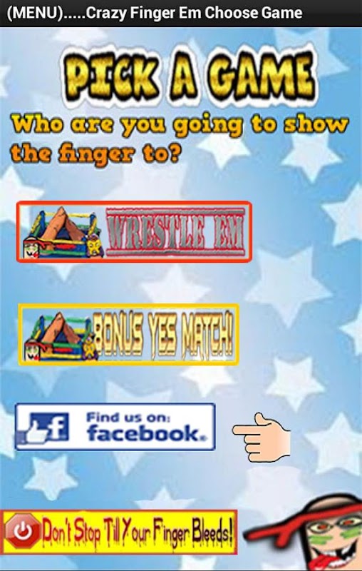 RETRO CLASSIC GAME....A back to basic classical finger game, this is the BEST finger poking action game around. 2 free unofficial matches where you can exercise and bash your finger to the max. All you have to do is hit the sneaky wrestlers to beat the difficult but achievable high score and become the new CRAZY FINGER EM (CFE) CHAMPION. Hit the bonus items and avoid the referees who will get in your way.