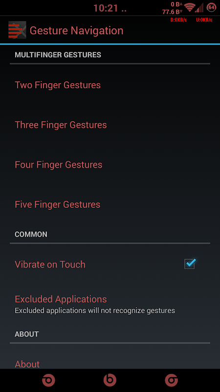 السيطرة على الملاحة الروبوت مع لفتات اللمس المتعدد، وهذا التطبيق يعمل على رأس أي التطبيقات ويمكنك التخلص تماما من استخدام مفاتيح لينة أو الأجهزة keys.You يمكن التنقل إلى أي التطبيق مع من يذهب إلى درج التطبيق وتوفير الكثير من الوقت و يمكنك القيام به بشكل فعال للغاية مع لفتات بسيطة متعددة المهام.