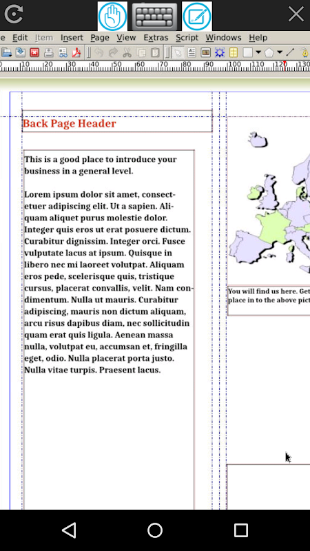 This app is an adaptation for Android of Scribus, which is a free open source system released under terms of GNU GPL version 2. A guide about how to use this app can be found at http://wiki.scribus.net/canvas/Help:TOC