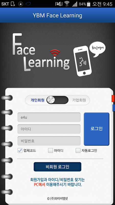 (e4u 회원 로그인 : YBM Family 계정 / B2B 회원 로그인 : 기업 업체코드 및 계정)