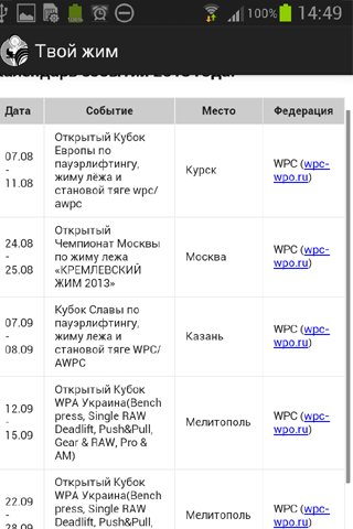 Встроен календарь соревнований по пауэрлифтингу и жиму лежа.