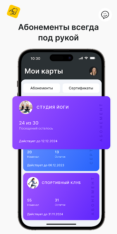مع YPLACES ستعرف دائمًا الزيارات المتبقية ومدة صلاحية الاشتراك. وفي أي وقت يمكنك تجديد اشتراكك أو شراء شهادة مباشرة في التطبيق.