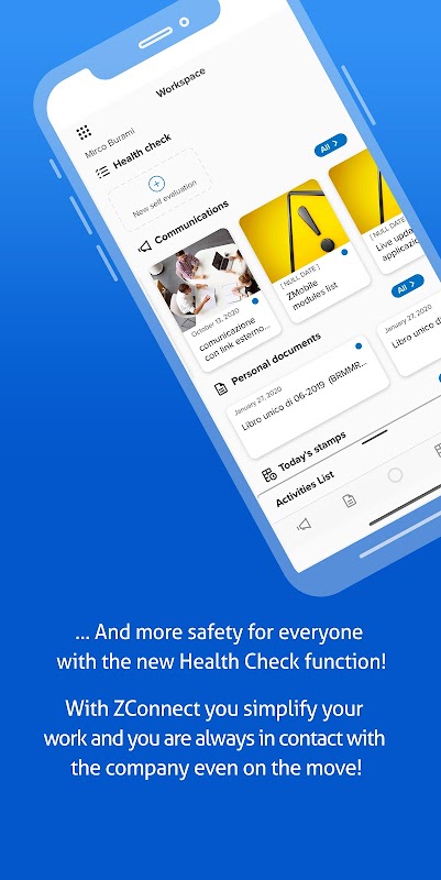 يُمكن لتطبيق ZConnect أن يُصبح أيضًا بوابة الوصول الوحيدة لجميع وظائف الهاتف المحمول ضمن مجموعة إدارة الموارد البشرية من Zucchetti: بهذه الطريقة، ومن خلال تطبيق فريد وشامل، سهل الاستخدام، يُمكنك الوصول إلى كل ما تحتاجه لتبسيط عملك والمشاركة في حياة الشركة.