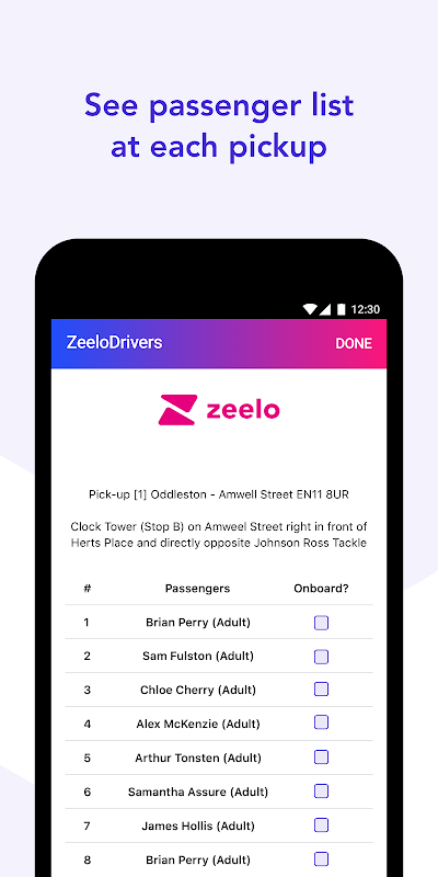 The Zeelo Driver app provides drivers with all the information they need for each trip and includes features such as stop-by-stop locations, turn-by-turn navigation, passengers lists and vehicle tracking. We've included some driver rewards too!