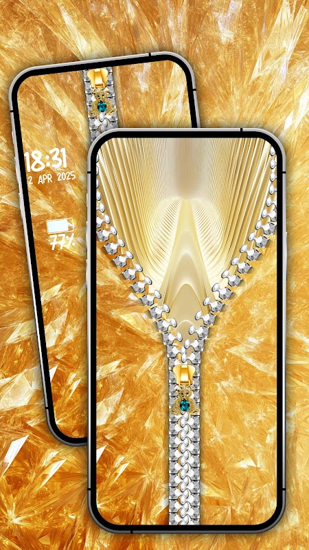 Zipper Effect LockScreen هو تطبيق يتيح لك تخصيص شاشة قفل جهازك بموضوع ذهبي وخلفية فريدة. إنه يقدم مجموعة متنوعة من الخلفيات الجميلة عالية الدقة ذات اللون الذهبي بأنماط مختلفة. يمكنك تحديد الخيارات المثالية لك، بما في ذلك اللون ونمط البرق وتصميم خلفية الشاشة، لإنشاء شاشة قفل مخصصة وأنيقة.