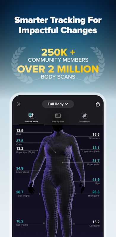 شبكة ثلاثية الأبعاد: توفر لك طريقة العرض الشبكية الافتراضية لدينا رؤية لكامل الجسم بزاوية 360 درجة لجسمك والتي تتميز ببيانات قياس لـ 12 منطقة رئيسية في جسمك