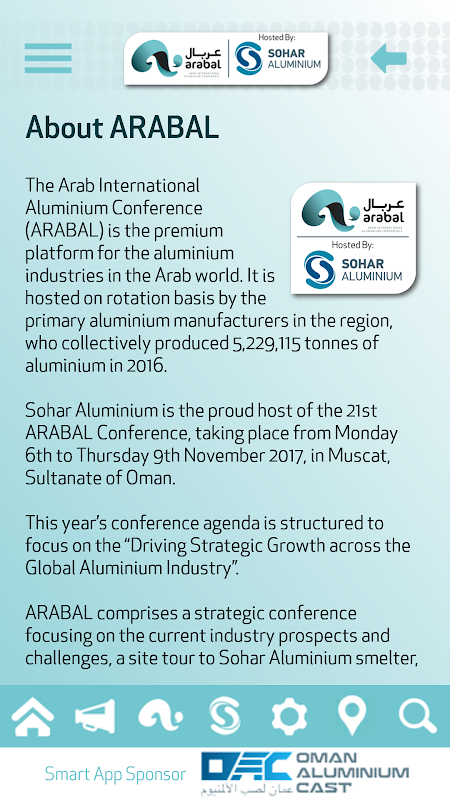 ARABAL comprises a strategic conference focusing on the current industry prospects and challenges, a site tour to Sohar Aluminium smelter, an international exhibition and various other workshops, meetings, and entertainment activities.