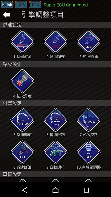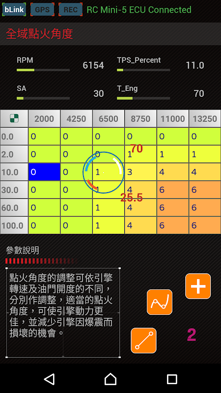5. Engine parameters adjust: Fuel Base, Fuel Adj., Fuel Acc.,Spark Angle, Idle RPM, RPM Limit, VVA Control, Dec Fuel Cut, Auto Tune, WB O2 CL, Quick Shift, Speed Gain, Coolant Fan, TPS Learn