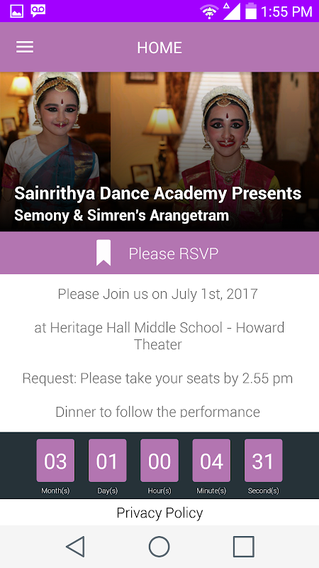 This App is an invitation for Simren and Semony’s Arangetram.This App will help our guests plan their trip and give them details about the Arangetram festivities. Once you login, you will be able to RSVP, plan your stay, learn about the dance performance, and Oklahoma City.
