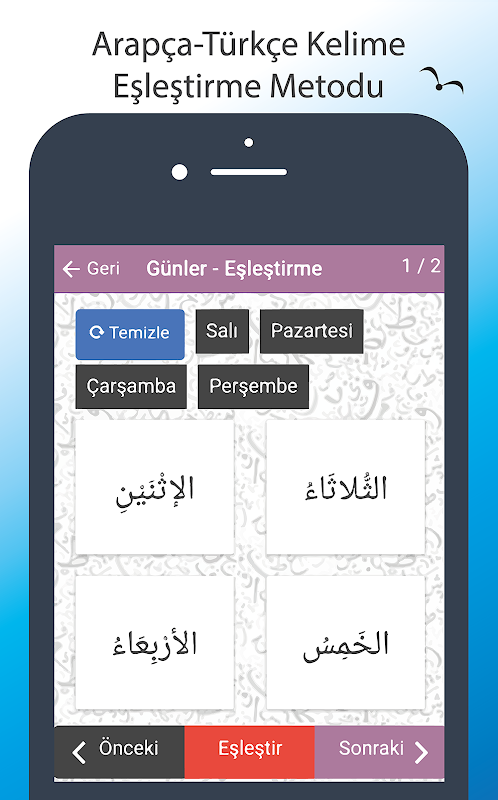 3-Eşleştirme: rastgele çıkan 4 arapça kelime ile cevapları olan 4 türkçe kelimeyi eşleştirmeye çalışın. Yanlış eşleştirmeler varsa temizleyin ve tekrar deneyin.