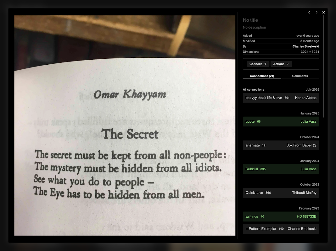 Are.na is a place to save content, create collections over time and connect ideas. Privately or with other people.