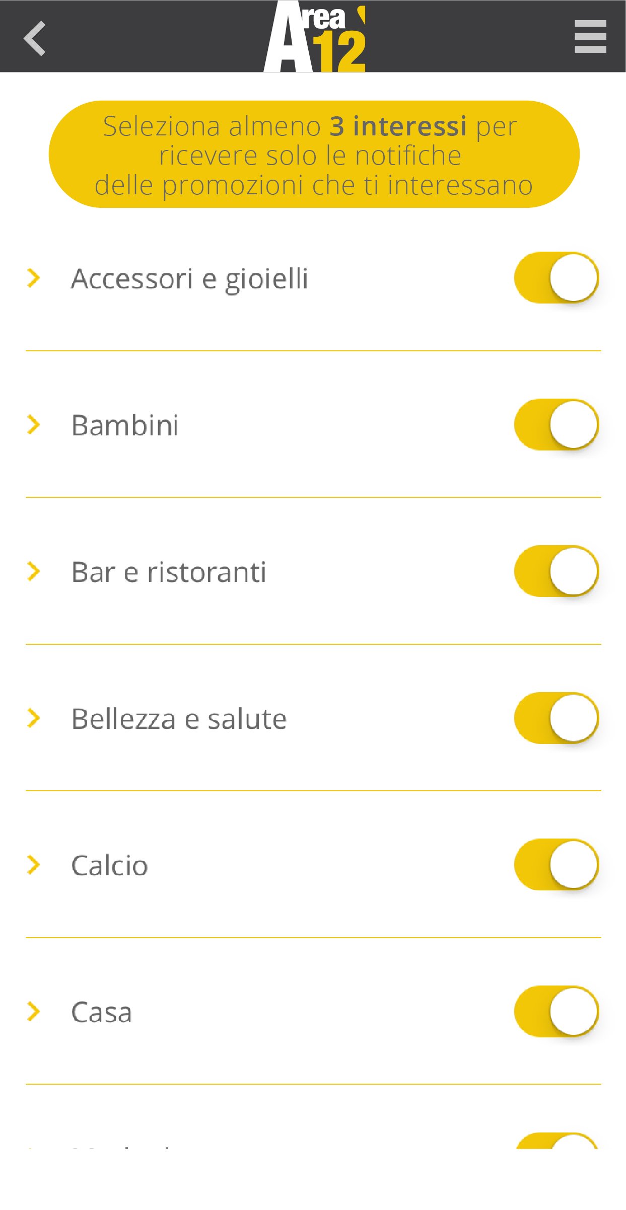 Scarica l’app gratis, registrati subito e grazie alle funzioni speciali di Area12 Plus potrai ricevere in modo personalizzato, direttamente sul tuo smartphone, promozioni su misura, offerte speciali, saldi flash, coupon, buoni sconto, e accedere a comodità ed eventi esclusivi dedicati ai possessori dell’app.
