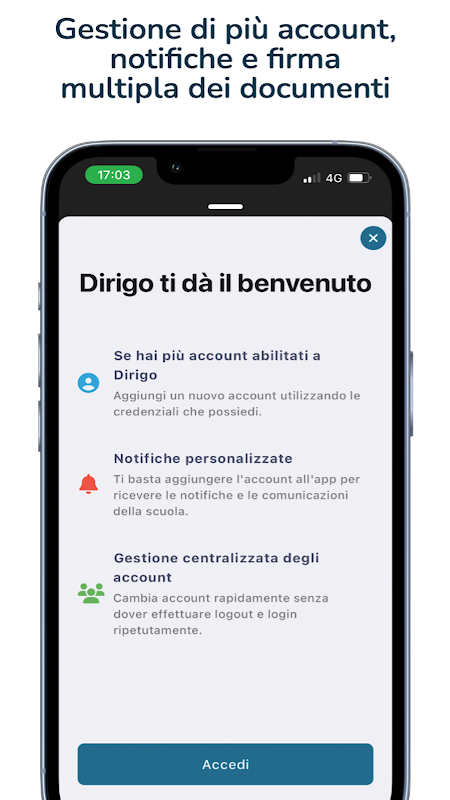 The app requires a license to use the Argo Dirigo software and at least one of the following applications: Alunni Web, Scuolanext, Personale Web, Bilancio Web, Gecodoc.