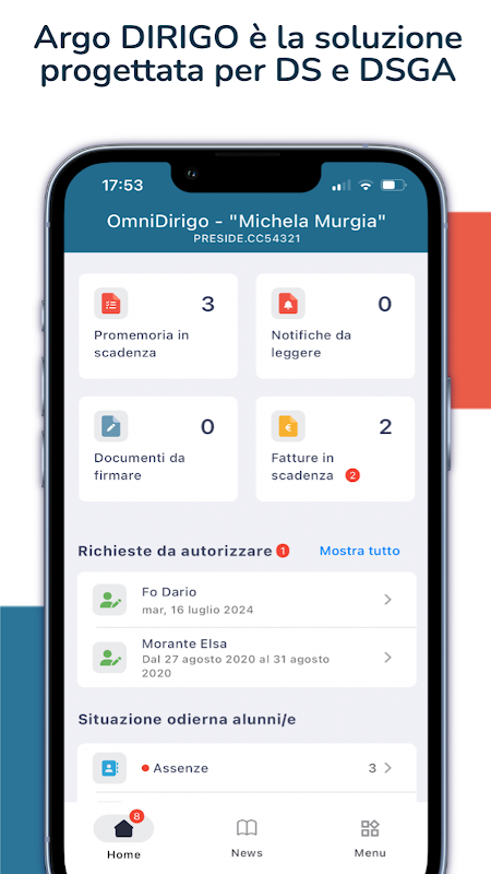 Argo Dirigo is the Argo Software app designed to allow DS and DSGA, from their smartphone or tablet, to monitor the teaching, personal, accounting, administrative and documentary area of the direct educational institution.