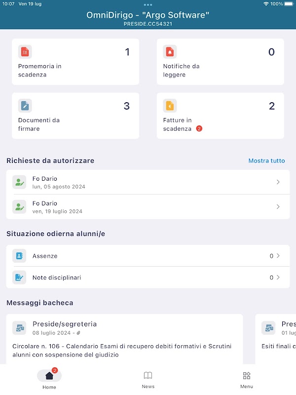 Through a collaboration with Orizzonte Scuola, Argo Dirigo also allows you to always stay up to date on news from the world of school, to know the latest regulations, to consult useful operational guides and the diary with the most important deadlines in the school world.