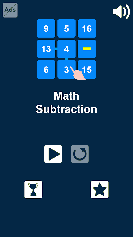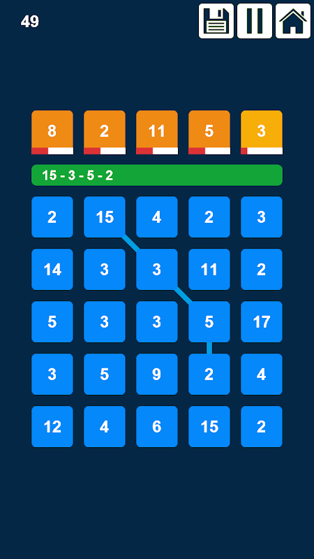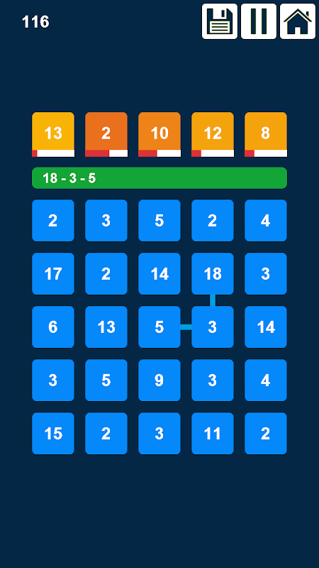 Connect 3 or more numbers so that the result of their subtraction is equal to one of the top numbers. You can connect numbers horizontally, vertically or diagonally. The longer the series of the connected numbers, the bigger the score you can get. You can undo the selection by getting back to the previous numbers.