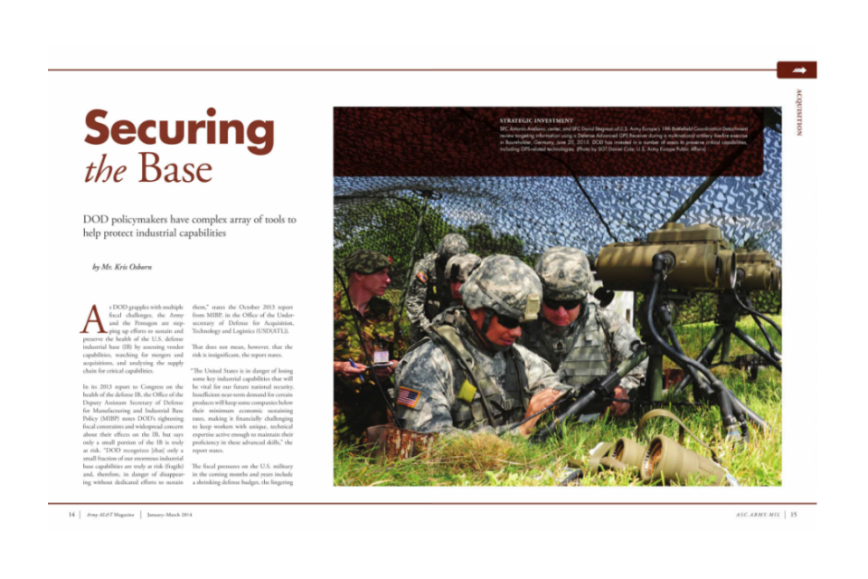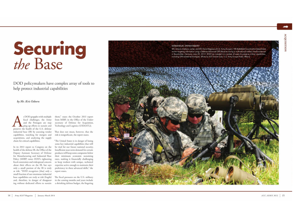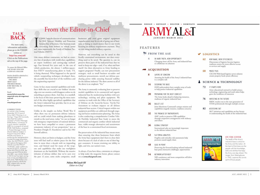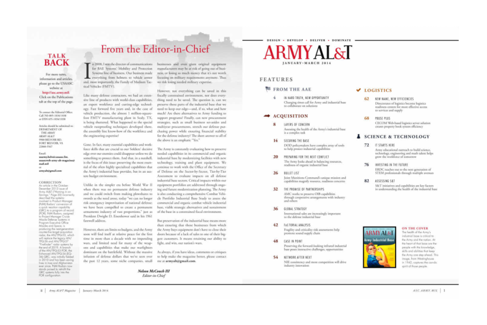 Army AL&T magazine is the professional journal of the U.S. Army Acquisition Support Center (USAASC). Published quarterly, the magazine’s mission is to instruct members of the Army acquisition, logistics and technology (AL&T) community relative to AL&T processes, procedures, techniques, and management philosophy and to disseminate other information pertinent to the professional development of workforce members and others engaged in AL&T activities. The USAASC reports to the Office of the Assistant Secretary of Defense for Acquisition, Logistics, and Technology (ASA(ALT)).