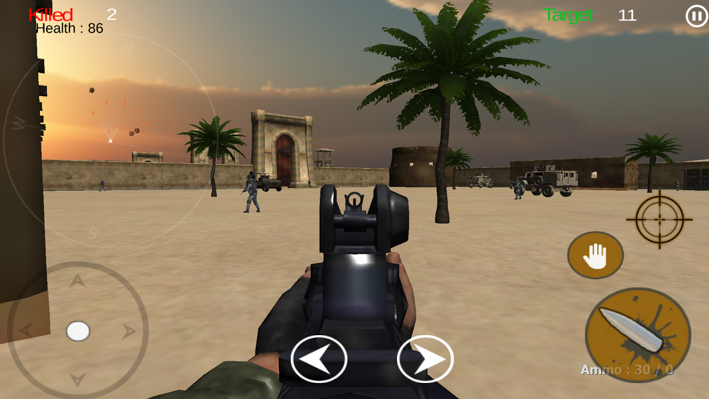 Battle Strike is a first person shooting game with multiple weapons including pistol, ak47, m4 , sniper rifle and short gun etc. army commando consists of different safe heavens of enemies in which user needs to pick enemy with the help of radar on screen and terminate enemy soldier. counter strike the attacking enemies first. this free shooting game will gave u best of shooting action game. game play includes terminating armed enemies who are really intellegent.