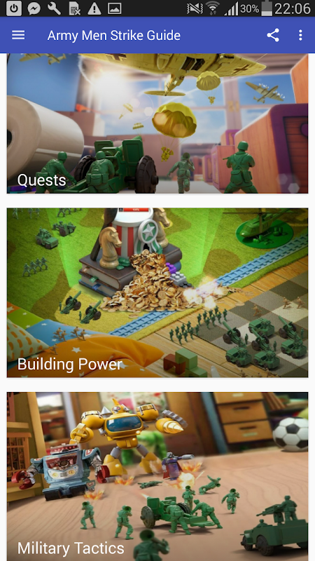 This app is created for all Army Men Strike lovers and introduces a full guideline for this awesome game. It's loaded with tons of useful tips, descriptions and tricks, as follows: