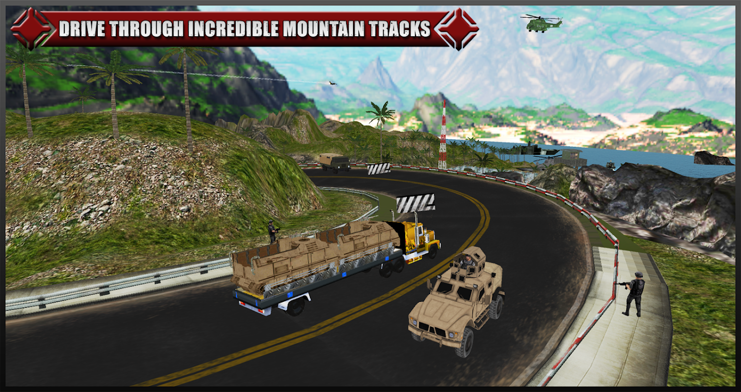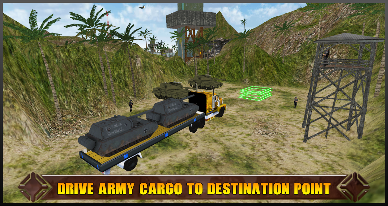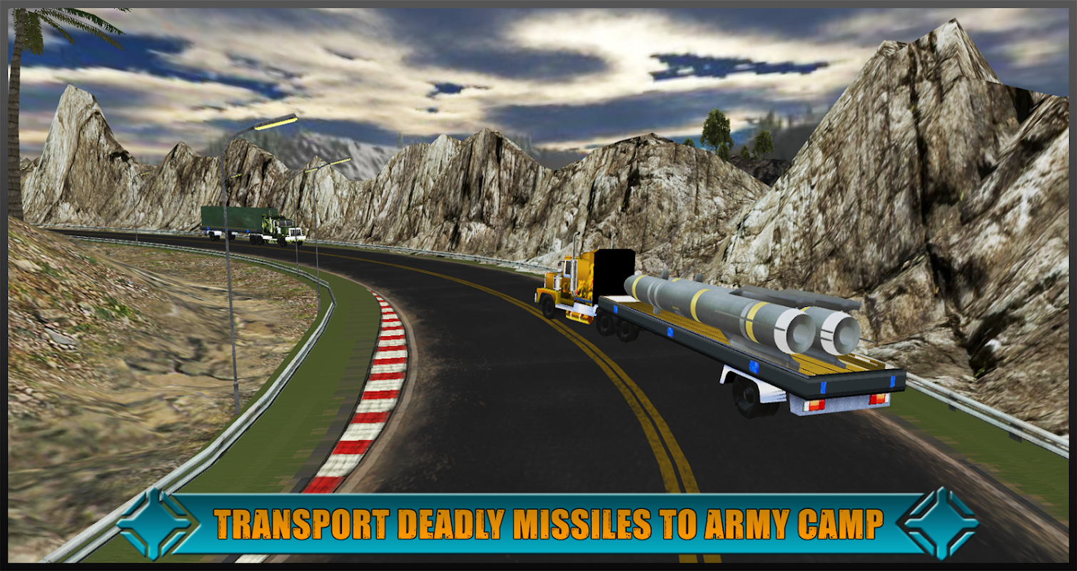 Drive army cargo bomb delivery trailer in army base areas and enjoy
