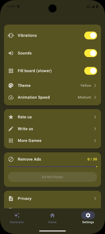 Choose from 6 color themes: Dark, Green, Red, Yellow, Orange, and Black & White. Adjust animation speed, toggle vibration and sound — play the way you