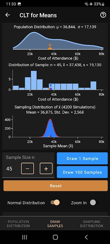 Visualize how the sampling distribution builds, step-by-step. Explore the effect on the sampling distribution as you increase the sample size. Overlay the normal distribution.
