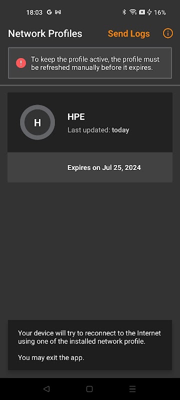 The network profiles are used for secure access to Wi-Fi and enable client devices to connect with the appropriate network access as configured by your organization’s network administrator. The app can be used to renew the network profiles before they expire, requiring little to no effort on behalf of the admin or end user. HPE Aruba Networking Onboard works in conjunction with the Cloud Authentication & Policy feature deployed on HPE Aruba Networking Central.