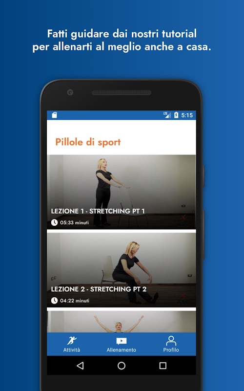 L’applicazione permette di visualizzare le attività sportive disponibili sia svolte all’interno di strutture o all’aperto in presenza sia svolte online.
