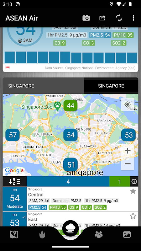 ASEAN Air quality report with 1hr PM2.5(fine particulate matter), 24Hr PM2.5, 24Hr particulate matter (PM10), sulphur dioxide (SO2), nitrogen dioxide (NO2), ozone (O3), and carbon monoxide (CO).
