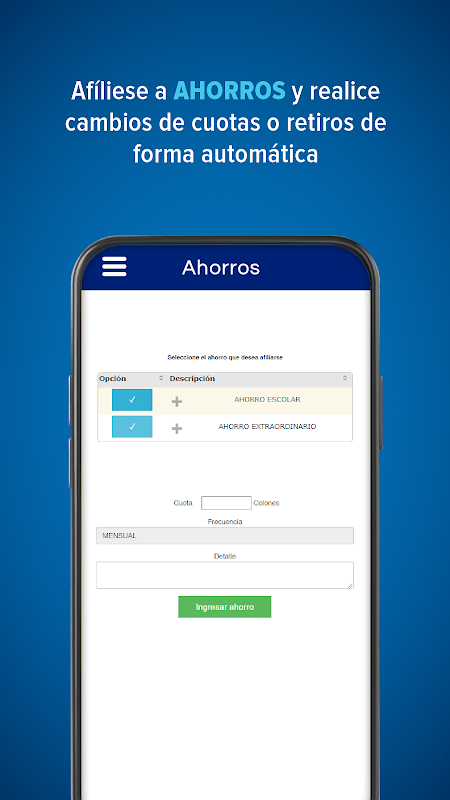 Mobile APP, its design and usefulness is focused on projecting an innovative profile of your financial institution, publicizing new products and services, offering more communication options with its associates. With this tool, the associate will be able to make information queries in real time, in an agile and simple way, on Android operating systems.