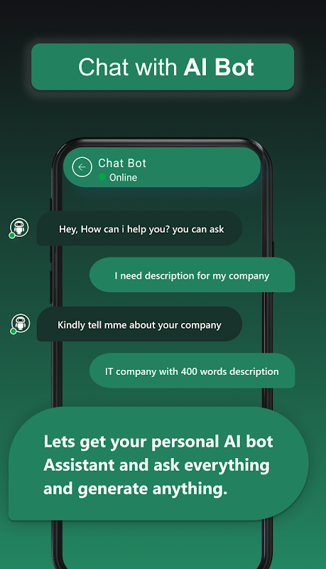 This AI bot can also be your Ask Me. Whether you're brainstorming or creating creative content, the ChatBot app will always have your back. Chat AI anything is a versatile tool in areas such as language learning and text production and can be used in many different application areas.