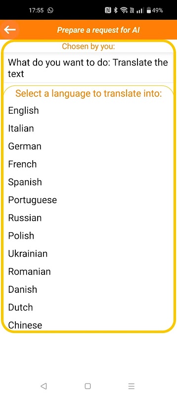 By answering simple questions, you can quickly prepare a request to AI at a professional level and get an immediate response from AI, even if you are not a registered user. For example, you can: prepare your official letter, correct or translate your text, create a professional PROMPT for AI for different business needs, and ask any question.... and all this in 12 languages (English, Italian, German, French, Spanish, Portuguese, Russian, Polish, Ukrainian, Romanian, Danish, Dutch and Chinese)!
